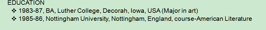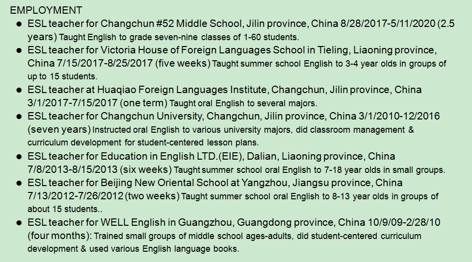 我有熱情和渴望幫助所有年齡繼續(xù)深入現(xiàn)代世界。我在中國有十五年的ESL教育經(jīng)驗。我致力于教學(xué),作為一種對學(xué)習(xí)持久熱愛的建議。我想提供一個正面的例子,來說明幫助他人實現(xiàn)目標(biāo)的持久價值。 |