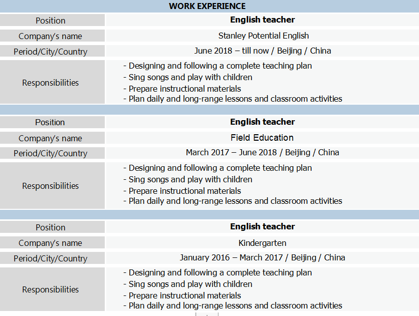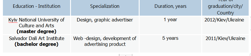 教育程度-機構(gòu)專業(yè)持續(xù)時間,年份畢業(yè)年份/城市/ 國家 基輔國立文化藝術(shù)大學 (碩士學位)設(shè)計,平面廣告商1年2012 /基輔/烏克蘭 薩爾瓦多·達利藝術(shù)學院(學士學位)網(wǎng)絡(luò)-廣告產(chǎn)品的設(shè)計,開發(fā)5年2011 /基輔/烏克蘭 司名稱斯坦利英語 期間/城市/國家/地區(qū)2018年6月–至今/北京/中國 職責-設(shè)計并遵循完整的教學計劃 公司名稱Field Education 期間/城市/國家/地區(qū)2017年3月– 2018年6月/北京/中國 職責-設(shè)計并遵循完整的教學計劃 公司名稱幼兒園 期間/城市/國家/地區(qū)2016年1月– 2017年3月/北京/中國 職責-設(shè)計并遵循完整的教學計劃 |