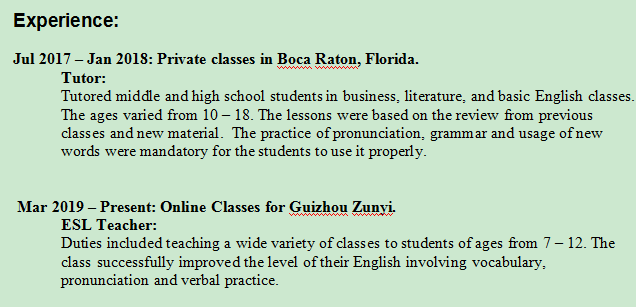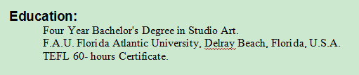 Alex 阿里克斯+委內(nèi)瑞拉男(母語是西班牙語,12歲搬到美國),持美國護(hù)照+美國弗羅里達(dá)大西洋大學(xué)藝術(shù)專業(yè)本科畢業(yè),tefl+自理學(xué)生簽(10月底到期),工簽資料準(zhǔn)備中,想辦理工簽+求職地點(diǎn)不限+目前在云南麗江,可盡快到崗~發(fā)音堪比母語?。?! |