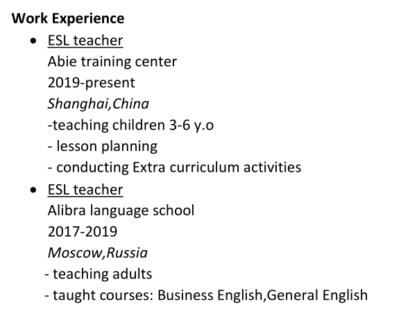 工作經(jīng)驗(yàn) ?ESL老師 培訓(xùn)中心 2019年至今 上海,中國(guó) -教孩子3-6歲 -課程計(jì)劃 -進(jìn)行額外的課程活動(dòng) ?ESL老師 語(yǔ)言學(xué)校 2017-2019 俄羅斯莫斯科 -教成人 -教學(xué)課程:商務(wù)英語(yǔ),普通英語(yǔ) 教育 ?歷史學(xué)士學(xué)位 有CELTA |