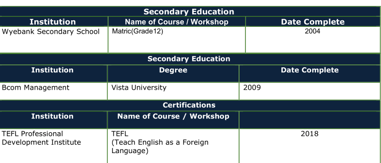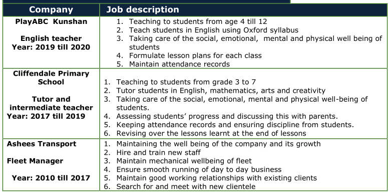 大學(xué) 2009年 資質(zhì)認(rèn)證 課程/講習(xí)班的機(jī)構(gòu)名稱 tefl(對外英語教學(xué)語言) 2018年 公司職位描述 昆山 英語老師 年:2019至2020 1.為4至12歲的學(xué)生提供教學(xué) 2.使用牛津教學(xué)大綱教學(xué)生英語 3.照顧人的社交,情感,心理和身體健康 學(xué)生們 4.制定每堂課的教學(xué)計劃 5.維護(hù)出勤記錄 克里芬代爾小學(xué) 導(dǎo)師和中級老師 年:2017至2019 1.教給3至7年級的學(xué)生 2.輔導(dǎo)英語,數(shù)學(xué),藝術(shù)和創(chuàng)造力的學(xué)生 3.照顧兒童的社交,情感,心理和身體健康 學(xué)生們。 4.評估學(xué)生的進(jìn)步并與父母討論。 5.保持出勤記錄并確保學(xué)生紀(jì)律。 6.在課程結(jié)束時修訂所學(xué)的課程 |