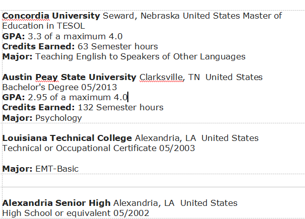 教育經(jīng)歷: 內(nèi)布拉斯加州康考迪亞大學(xué)蘇厄德分校 美國教育碩士 奧斯汀皮伊州立大學(xué)田納西州克拉克斯維爾 ---心理學(xué)本科 工作經(jīng)歷: 上海幼兒園, 2年 經(jīng)驗(yàn)。 |