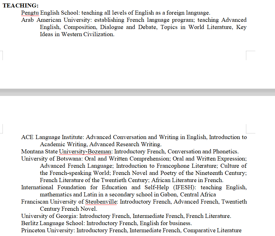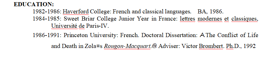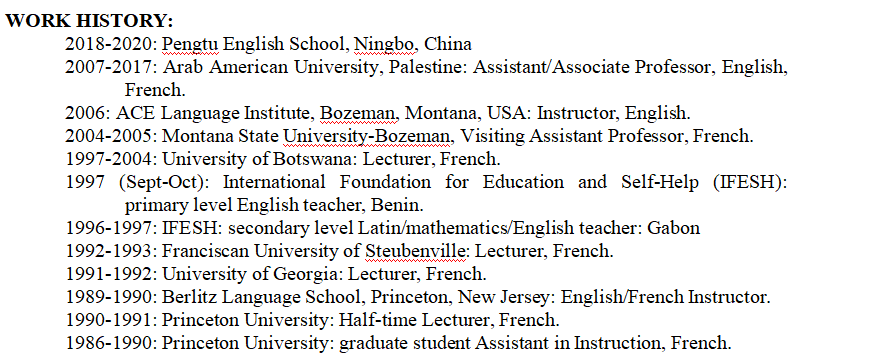教育: 1982年至1986年:哈弗福德學(xué)院:法語和古典語言。文學(xué)士,1986年。 1984年至1985年:法國Sweet Briar大學(xué)初中:巴黎第四大學(xué),現(xiàn)代與經(jīng)典文學(xué)。 1986-1991年:普林斯頓大學(xué):法語 工作經(jīng)歷: 2018-2020:寧波蓬圖英語學(xué)校 2007年至2017年:巴勒斯坦阿拉伯美國大學(xué):英語/法語助理/副教授 2006年:美國蒙大納州博茲曼市ACE語言學(xué)院:英語講師。 2004年至2005年:蒙大拿州立大學(xué)-博茲曼分校,法語系客座助理教授。 1997年至2004年:博茨瓦納大學(xué):講師,法語。 1997年(9月):國際教育和自助基金會(huì)(IFESH):貝寧小學(xué)英語老師。 1996-1997年:IFESH:中學(xué)英語/拉丁語/數(shù)學(xué)/英語教師:加蓬 1992-1993年:Steubenville方濟(jì)會(huì)大學(xué):講師,法語。 1991-1992年:佐治亞大學(xué):講師,法語。 1989-1990年:新澤西州普林斯頓貝立茲語言學(xué)校:英語/法語講師。 1990年至1991年:普林斯頓大學(xué):法語半日制講師。 1986年至1990年:普林斯頓大學(xué):研究生教學(xué)助理,法語。 |