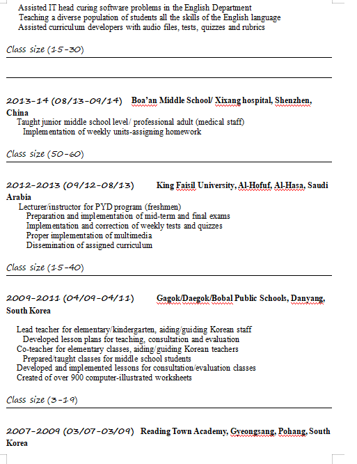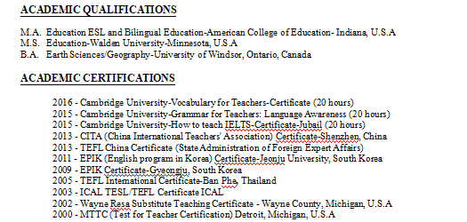 教育-美國明尼蘇達州華登大學 B.A.地球科學/地理-加拿大安大略省溫莎大學 學術認證 2016年-劍橋大學-教師詞匯量-證書(20小時) 2015年-劍橋大學語法教師:語言意識(20小時) 2015年-劍橋大學-雅思考試課程-證書課程-朱拜爾(20小時) 2013年-CITA(中國國際教師協(xié)會)證書-中國深圳 2013年-TEFL中國證書(國家外國專家局) 2011-EPIK(韓國英語課程)證書-韓國全州大學 2009年-EPIK證書-韓國慶州 2005年-TEFL國際證書-泰國班貝 2003年-獲得ICAL TESL / TEFL證書ICAL 2002年-韋恩·雷薩(Wayne Resa)替代教學證書-美國密歇根州韋恩縣 2000年-美國密歇根州底特律MTTC(教師資格認證考試) 教學經(jīng)驗 : 2017(05/30)-至今東北師范大學/美國羅格斯/中國 2014-17(09 / 14-05 / 17)沙特阿拉伯朱拜勒大學皇家學院 2013-14(08 / 13-09 / 14)中國深圳西鄉(xiāng)醫(yī)院博安中學 2012-2013(09 / 12-08 / 13)費希爾國王大學,沙特阿拉伯哈薩克斯坦哈弗夫 2009-2011(04 / 09-04 / 11)Gagok / Daegok / Bobal公立學校,韓國丹陽 2006-2007(03 / 06-03 / 07)GnB /湯姆英語學院慶北,韓國慶州 2005年-2006年(03 / 05-03 / 06)E.C.C.學院,韓國金海市內(nèi)洞 |