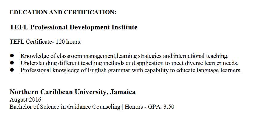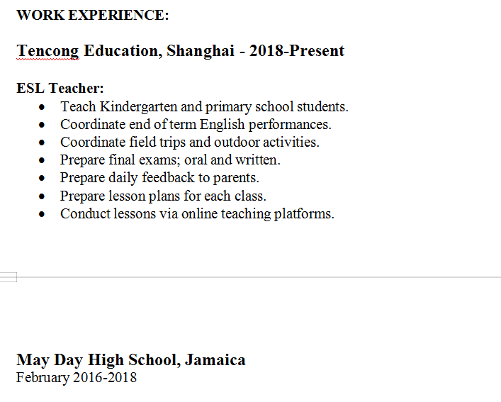 教育和認證: TEFL專業(yè)發(fā)展學(xué)院 TEFL證書-120小時: ?關(guān)于課堂管理,學(xué)習(xí)策略和國際教學(xué)的知識。 ?了解不同的教學(xué)方法和應(yīng)用,以滿足不同學(xué)習(xí)者的需求。 ?專業(yè)的英語語法知識,能夠教育語言學(xué)習(xí)者。 牙買加北加勒比大學(xué),2016年8月 指導(dǎo)咨詢理學(xué)學(xué)士 工作經(jīng)驗: (上海)-2018年至今 ESL老師: ?教幼兒園和小學(xué)生。 ?協(xié)調(diào)學(xué)期英語表演。 ?協(xié)調(diào)實地考察和戶外活動。 ?準(zhǔn)備期末考試;口頭和書面。 ?準(zhǔn)備對父母的日常反饋。 ?為每個課程準(zhǔn)備課程計劃。 ?通過在線教學(xué)平臺進行課程。 |