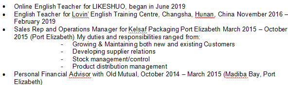 ?LIKESHUO的在線英語老師于2019年6月開始 ?Lovin’s英語培訓中心的英語老師,中國湖南長沙,2016年11月– 2019年2月 文學學士學位,商業(yè)和社會學專業(yè) |