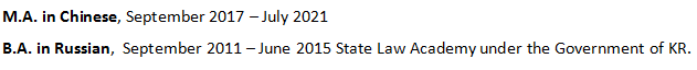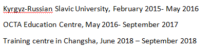 教育 碩士,2017年9月– 2021年7月 B.A. 俄語,2011年9月– 2015年6月 工作 OCTA教育中心,2016年5月至2017年9月 長(zhǎng)沙培訓(xùn)中心,2018年6月– 2018年9月 |