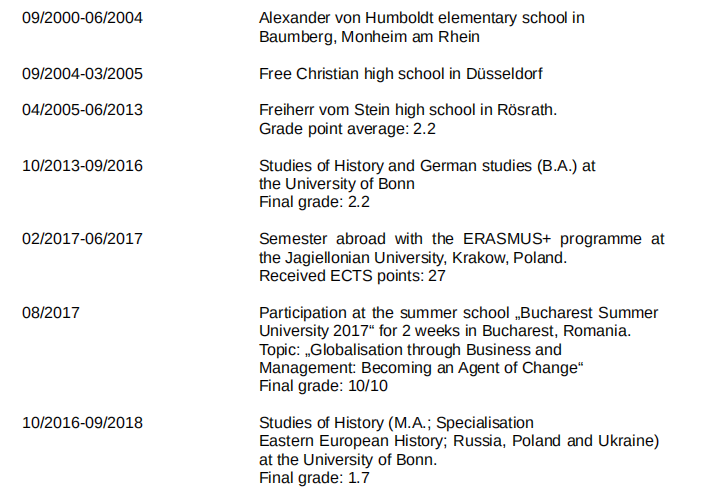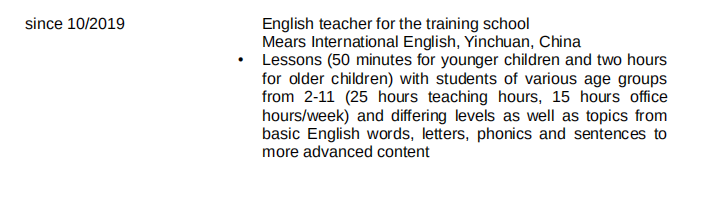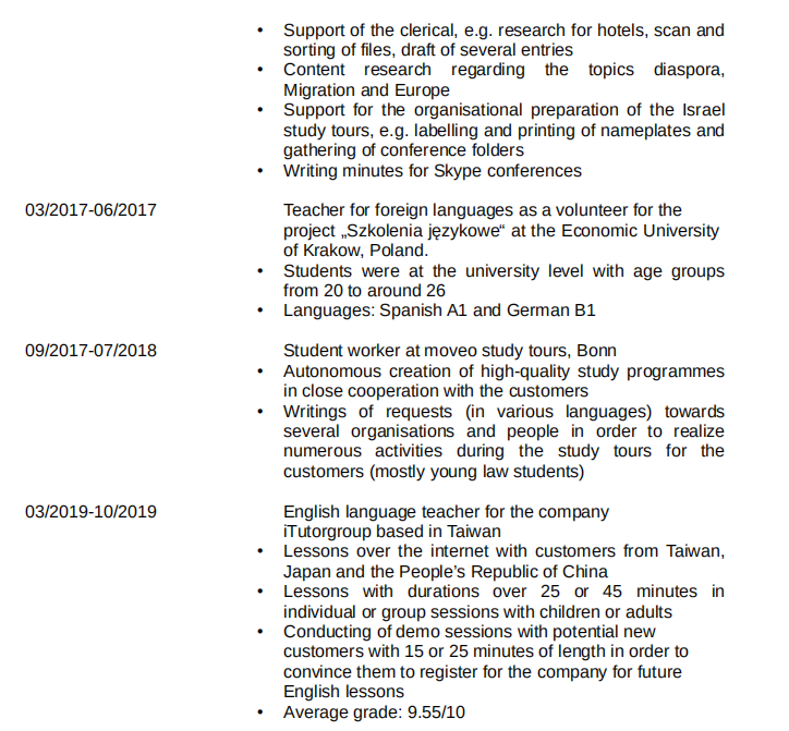 德國(guó),世界一流大學(xué)波恩大學(xué)(東歐歷史碩士,歷史與德國(guó)研究本科)有TEFL, 會(huì)波蘭語(yǔ)、阿拉伯語(yǔ)、法語(yǔ)、塞爾維亞語(yǔ)、西班牙語(yǔ)、土耳其語(yǔ)、葡萄牙語(yǔ)、漢語(yǔ)等12種語(yǔ)言,參加過(guò)國(guó)際氣候變化回憶,歐洲志愿者服務(wù)組織等活動(dòng),有大學(xué)和培訓(xùn)機(jī)構(gòu)教學(xué)經(jīng)驗(yàn) |