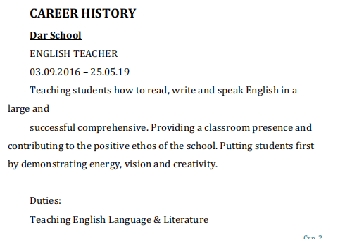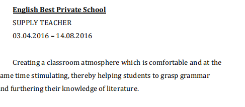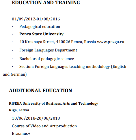 教育和培訓(xùn) 教育學(xué) ·奔薩州立大學(xué) 外語系 ·教育學(xué)學(xué)士 附加教育 里斯巴商業(yè)科技大學(xué) 錄像和藝術(shù)制作課程 工作經(jīng)歷 達爾學(xué)校 英語老師 2016/03/09 – 19.05.19 教學(xué)生如何用英語閱讀,寫作和說英語 英語最佳私立學(xué)校 英語老師 2016年3月4日– 2016年8月14日 營造舒適的教室氛圍 |