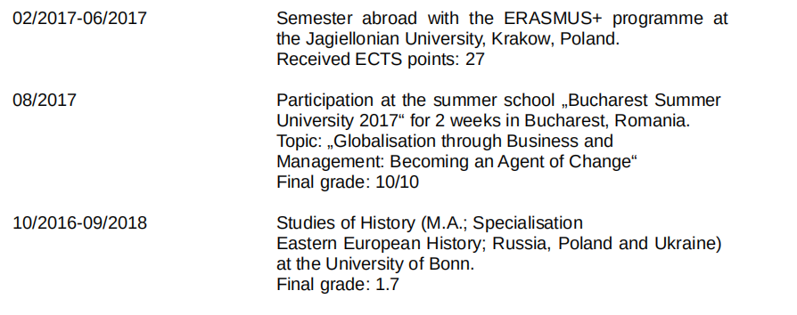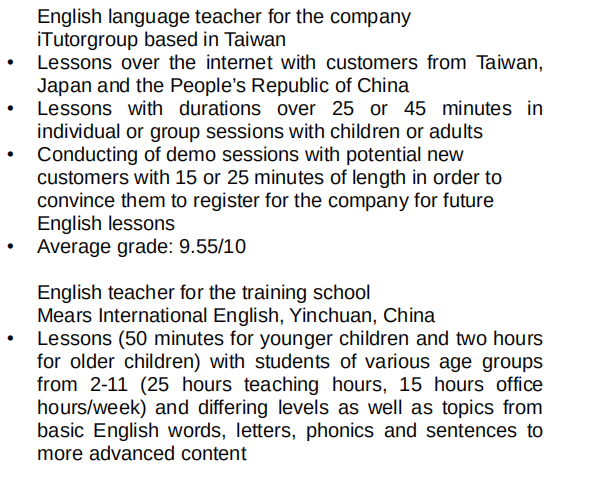 歷史研究和德國研究(文學(xué)士) 波恩大學(xué) tefl 碩士 在波恩大學(xué) Mears International English,中國銀川 03 / 2019-10 / 2019公司英語老師 |