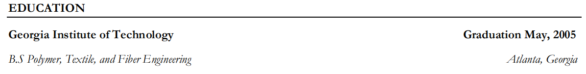 教育背景: 喬治亞理工學院畢業(yè),2005年5月 喬治亞州亞特蘭大B.S聚合物,紡織和纖維工程 |