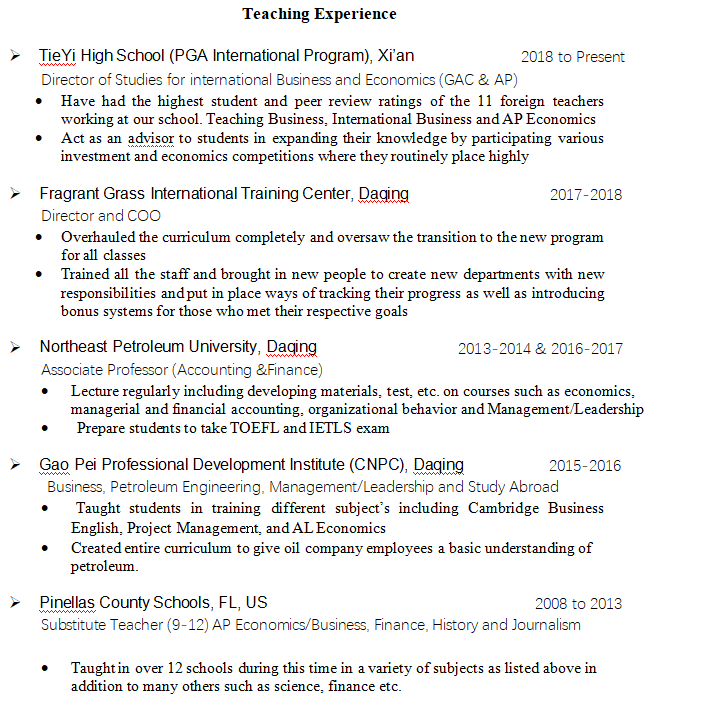 教學(xué)經(jīng)驗 ?TieYi高中(PGA國際計劃),西安2018至現(xiàn)在 國際商務(wù)和經(jīng)濟(jì)學(xué)研究主任(GAC&AP) 度 ?東北石油大學(xué),大慶2013-2014&2016-2017 副教授(會計與金融)
