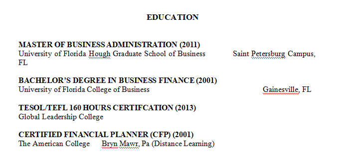 代課老師(9-12)AP經(jīng)濟(jì)學(xué)/商業(yè),金融,歷史和新聞學(xué) ?除科學(xué),金融等許多其他學(xué)科外,這段時間在上述12所學(xué)校中教授了各種學(xué)科。 ?擔(dān)任教師5年,既可以作為長期替代者,也可以在必要時作為短期替代者;大部分時間都花在教授AP課程上,主要是經(jīng)濟(jì)學(xué)和商科,以及AP歷史,哲學(xué)等科目。在此期間,我沒有教過的唯一AP或其他科目是數(shù)學(xué)。 ?我的大多數(shù)學(xué)生在ap考試中得分為5或4,并且畢業(yè)時的平均未加權(quán)GPA為3.84 人銀行家 教育 工商管理碩士(2011) 佛羅里達(dá)大學(xué)霍夫商學(xué)院研究生院圣彼得堡校區(qū) 學(xué)士學(xué)位的商業(yè)融資(2001) 佛羅里達(dá)大學(xué)商業(yè)學(xué)院,佛羅里達(dá)州蓋恩斯維爾 TESOL / TEFL 160小時認(rèn)證(2013)全球領(lǐng)導(dǎo)力學(xué)院 認(rèn)證財務(wù)規(guī)劃師(CFP)(2001) 美國賓夕法尼亞大學(xué)Bryn Mawr(遠(yuǎn)程學(xué)習(xí)) |