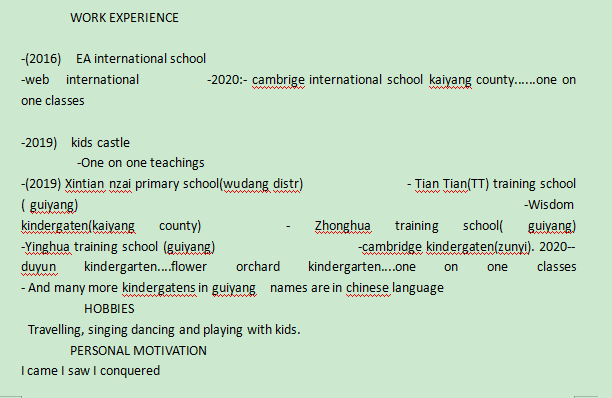 SUE+肯尼亞女+英語文學教育專業(yè)本科,tefl+自理家庭簽(202..03月延期)求職貴陽++目前在貴陽,盡快到崗~開朗陽光 |