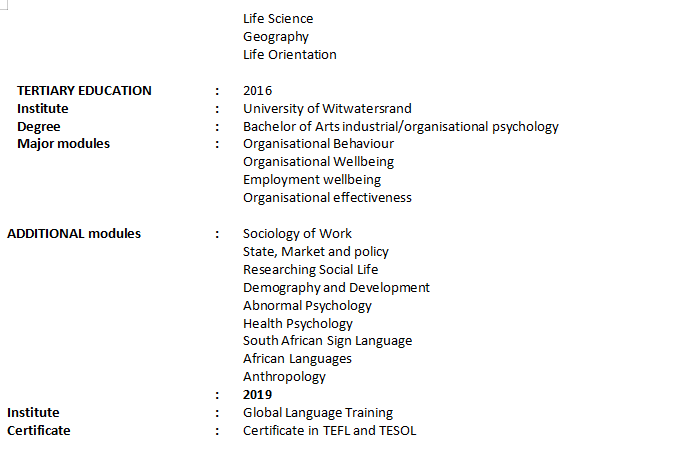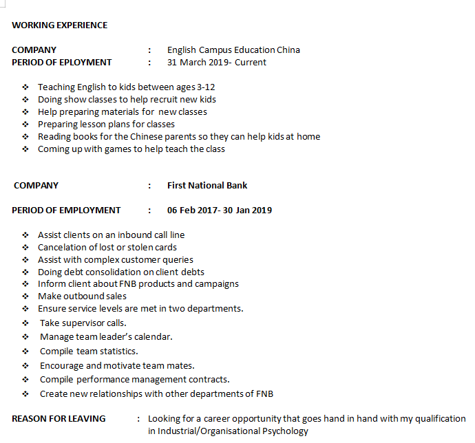 國籍: 津巴布韋 求職意向: 教師