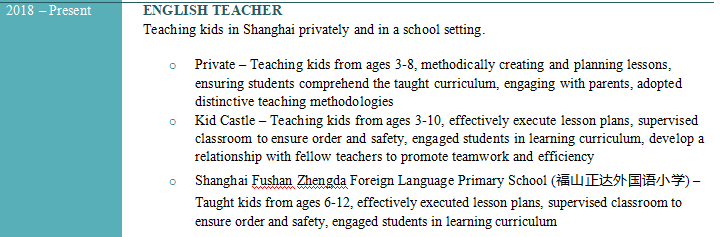 英語老師 在上海學校中教孩子 上海財經(jīng)大學 中國上海世界一流的金融和經(jīng)濟研究型大學。 國際商務碩士 2013年– 2017年 歐米茄學院(BBA(HONS),ABA(HONS) 位于巴哈馬拿騷的一所文理學院,與巴哈馬大學和加拿大西安大略大學的金斯大學學院有銜接協(xié)議。 o管理學工商管理學士 o管理學工商管理副學士 |