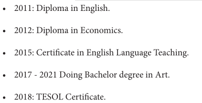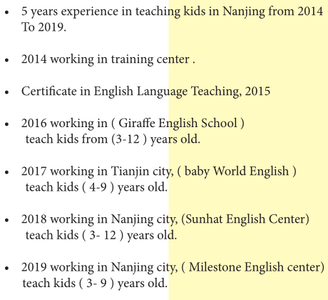 從2014年起到2019年在南京教孩子,有5年經(jīng)驗(yàn) ?2017年-2021年獲得藝術(shù)學(xué)士學(xué)位。 ?2018年:TESOL證書(shū) |