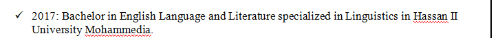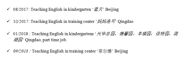 在北京“藍(lán)天”幼兒園教英語(yǔ) 2017年10月10日:在青島“媽媽洛可”培訓(xùn)中心教授英語(yǔ) ?01/ 2018:在青島“興華總園,德馨園,幸福園,信特園,瓏湖園”幼兒園教英語(yǔ),兼職。 ?09/ 2018:在北京“菲爾德”培訓(xùn)中心教授英語(yǔ) ?2017年:哈桑第二大學(xué)默罕默迪德大學(xué)(University of Hassan II University)語(yǔ)言學(xué)專業(yè)英語(yǔ)語(yǔ)言文學(xué)學(xué)士學(xué)位 |