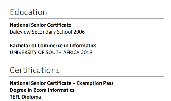 南非大學取得信息學商業(yè)學士,有TEFL證書,在南非和中國均有小學教學經(jīng)驗,10年以上,可以教英語,會計,數(shù)學 |