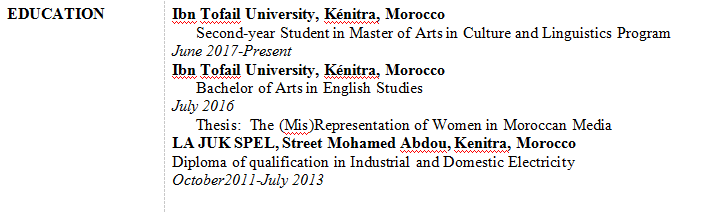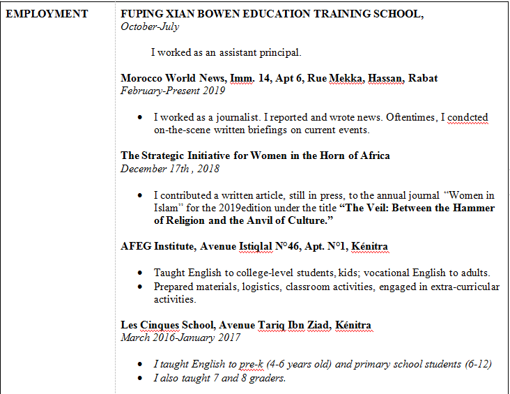 阜平縣博文教育培訓(xùn)學(xué)校 2019-2020 十月至七月 曾擔(dān)任校長助理和英語教師 。 摩洛哥世界新聞 ?我曾當(dāng)過新聞記者。我報道并寫了新聞。通常,我會在現(xiàn)場就時事進(jìn)行書面介紹。 非洲之角婦女戰(zhàn)略倡議 2018年12月17日 ?我為2019年版的《伊斯蘭教的女性》年度雜志撰寫了一篇仍在印刷中的文章,標(biāo)題為“面紗:介于宗教之錘和文化之砧之間?!?/p> AFEG學(xué)院, ?為大專生,孩子們教授英語;成人的職業(yè)英語。 ?準(zhǔn)備材料,后勤,課堂活動,參加課外活動。 凱尼特拉塔里克·伊本·齊亞德大街的學(xué)校 2016年3月至2017年1月 ?我曾為學(xué)前班(4-6歲)和小學(xué)生(6-12歲)教授英語 ?我還教過7年級和8年級學(xué)生。 摩洛哥凱尼特拉市的伊本·陶菲爾大學(xué) 文化語言學(xué)碩士課程二年級學(xué)生 2017年6月至今 摩洛哥凱尼特拉市的伊本·陶菲爾大學(xué) 英語研究文學(xué)學(xué)士 2016年七月 論文:摩洛哥媒體中婦女的代表 |