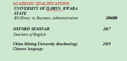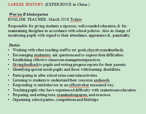 伊洛林-夸拉州立大學(xué) 2004-2008年工商管理學(xué)士(榮譽) 牛津研討會2017 影響英語技能的因素 中國礦業(yè)大學(xué)2019 中文 職業(yè)經(jīng)歷(在中國的經(jīng)歷) 文安乙幼兒園 英語老師:今天是2018年3月 負(fù)責(zé)給學(xué)生提供嚴(yán)格、全面的教育,并根據(jù)學(xué)校政策維持紀(jì)律。還負(fù)責(zé)監(jiān)控學(xué)生的出勤、儀表和守時情況。 職責(zé) 與其他教學(xué)人員一起制定目標(biāo)、目的和方法。 鼓勵學(xué)生提問并表達(dá)他們的困難。 建立有效的課堂管理實踐。 給學(xué)生反饋,并為他們的父母寫進度報告。 確定有特殊需要的學(xué)生和有學(xué)習(xí)障礙的學(xué)生。 參加課外活動。 傾聽學(xué)生的心聲,了解他們的關(guān)切和需求。 以有效且有分寸的方式應(yīng)對不當(dāng)行為。 教育在主流教育中遇到困難的學(xué)生。 準(zhǔn)備和設(shè)置測試、試卷和練習(xí)。 組織學(xué)校聚會、競賽和實地考察。 |