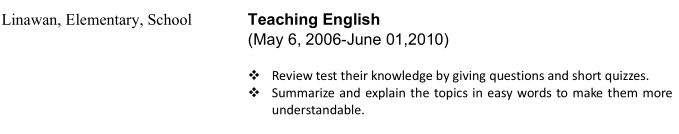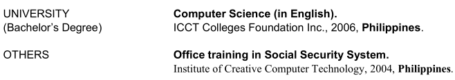 公司名 荔灣,小學(xué),學(xué)校 英語(yǔ)教學(xué) (2006年5月6日至2010年6月1日) 大學(xué)計(jì)算機(jī)科學(xué)(英文)。 學(xué)士學(xué)位ICCT Colleges Foundation Inc.,菲律賓,2006年 |