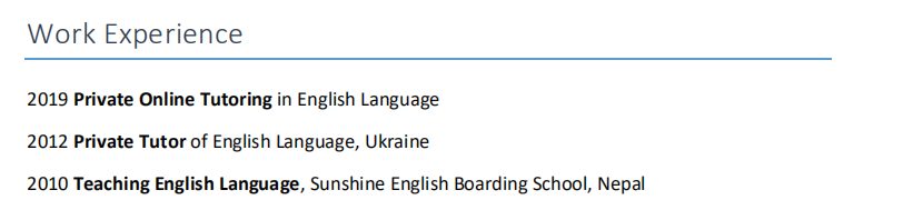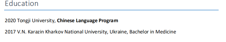 工作經(jīng)驗 2019英文在線私人輔導 2012烏克蘭英語私人家教 2010年,尼泊爾陽光英語寄宿學校英語教學 教育 2020年同濟大學中文系 2017年 烏克蘭Karazin Kharkov國立大學,醫(yī)學學士 語言能力 | |||