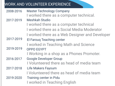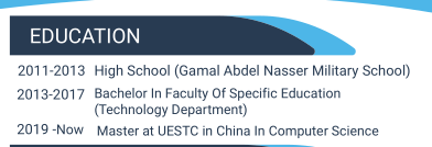 特殊教育學(xué)院學(xué)士 (技術(shù)部) 中國(guó)電子科技大學(xué)計(jì)算機(jī)科學(xué)碩士 2013-2017 萬(wàn)事達(dá)科技公司 我在那里工作是計(jì)算機(jī)技術(shù) 我在那兒擔(dān)任社交媒體主持人 我在那里擔(dān)任Web設(shè)計(jì)師和開(kāi)發(fā)人員 我在那里擔(dān)任媒體團(tuán)隊(duì)負(fù)責(zé)人 皮都培訓(xùn)中心2019-2020 |