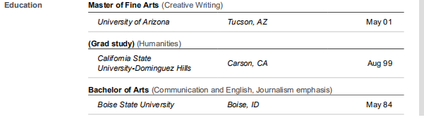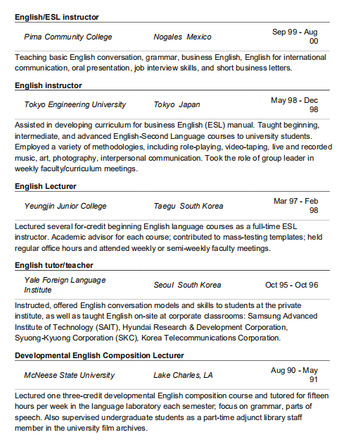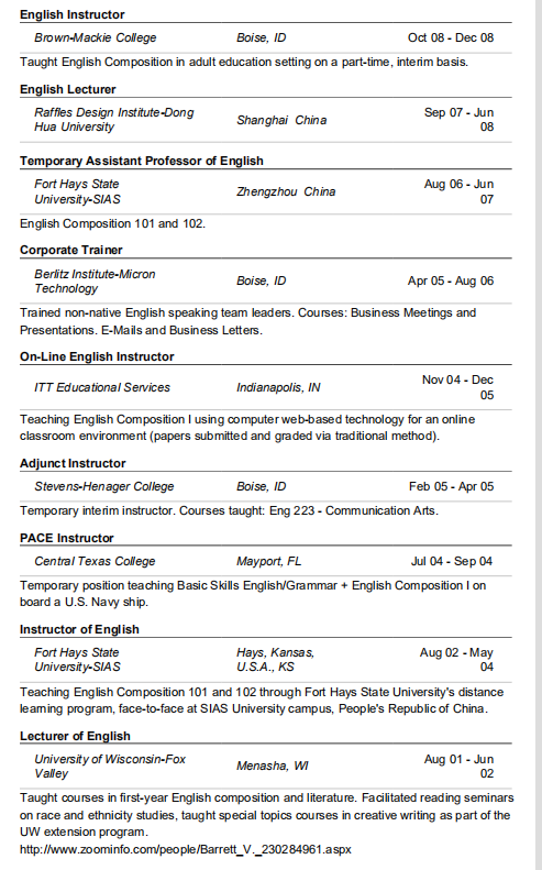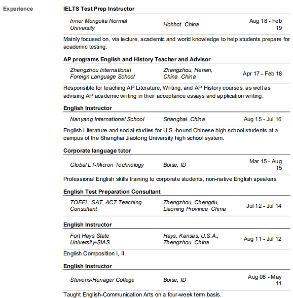 思考試預(yù)備教練 內(nèi)蒙古師范大學(xué) 呼和浩特大學(xué)中國 AP程序英語和歷史老師和顧問 鄭州國際 外語學(xué)校 河南鄭州 英文講師 中國上海南洋國際學(xué)校8月15日至7月16日 美國留學(xué)生在高中時期的英語文學(xué)和社會研究 上海交通大學(xué)高中校園。 企業(yè)語言導(dǎo)師 ID號3月15日-8月,全球LT-Micron Technology博伊西 15 針對公司學(xué)生,非英語母語人士的專業(yè)英語技能培訓(xùn) 英語考試準備顧問 中國遼寧省7月12日-7月14日 英文講師 英文講師 博伊西布朗麥基學(xué)院,ID 10月8日至12月8日 在非全日制基礎(chǔ)上,在成人教育環(huán)境中教授英語作文。 英文講師 來福士設(shè)計學(xué)院 教育藝術(shù) 碩士(創(chuàng)意寫作) 亞利桑那大學(xué)圖森分校 加利福尼亞州 文學(xué)學(xué)士(通訊和英語,新聞專業(yè)) |