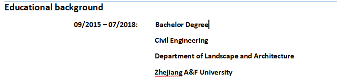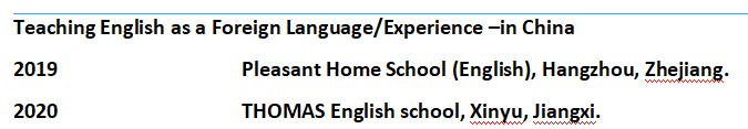 在中國(guó)教授英語(yǔ)作為一種外語(yǔ)/經(jīng)驗(yàn) 2019宜人家庭學(xué)校(英語(yǔ)),浙江杭州市。 2020年THOMAS英語(yǔ)學(xué)校,江西新余。 學(xué)歷 09/2015 – 07/2018: 學(xué)士學(xué)位 土木工程
