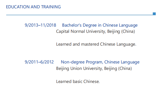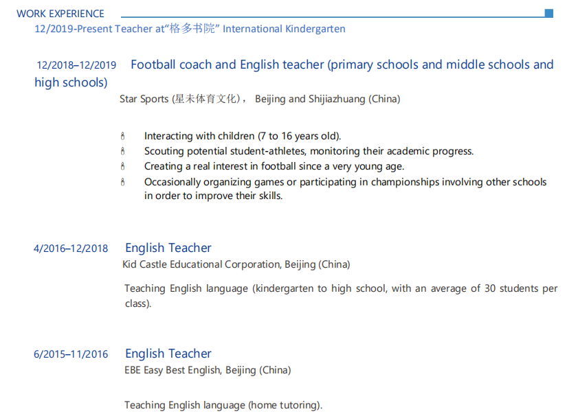 教學(xué)經(jīng)驗(yàn): 12 / 2018–12 / 2019幼兒園教師足球教練和英語(yǔ)老師(小學(xué)和初中以及北京和中國(guó)石家莊的星空體育?與兒童互動(dòng)(7至16歲)。搜尋潛在的學(xué)生運(yùn)動(dòng)員,監(jiān)控他們的學(xué)習(xí)進(jìn)度。從很小的時(shí)候就對(duì)足球產(chǎn)生了真正的興趣。偶爾組織比賽或參加涉及其他學(xué)校的錦標(biāo)賽 4 / 2016–12 / 2018英語(yǔ)老師兒童城堡教育公司,北京(中國(guó))英語(yǔ)教學(xué)(幼兒園到高中,每人平均30名學(xué)生) .6 / 2015–11 / 2016英語(yǔ)老師EBE Easy Best英語(yǔ),北京(中國(guó))教學(xué)英語(yǔ)(家庭輔導(dǎo)) 教育背景: 9 / 2013–11 / 2018中國(guó)語(yǔ)言學(xué)學(xué)士學(xué)位 首都師范大學(xué),北京(中國(guó))學(xué)習(xí)和掌握中文。 9 / 2011–6 / 2012非學(xué)位課程,中文北京聯(lián)合大學(xué),北京(中國(guó))學(xué)過(guò)基礎(chǔ)漢語(yǔ) |