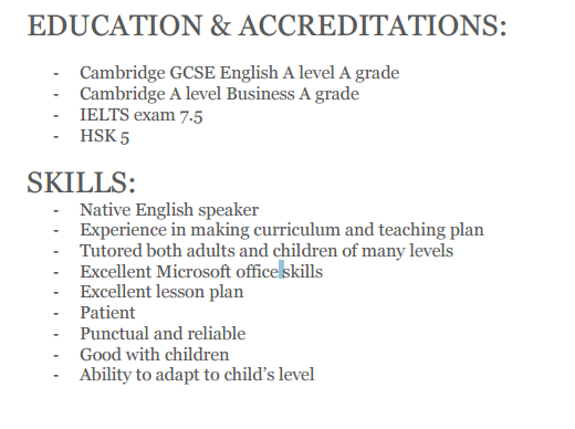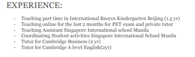 自我介紹,介紹國(guó)籍, 2年北京生活經(jīng)驗(yàn)和一年半教學(xué)經(jīng)驗(yàn),培訓(xùn)機(jī)構(gòu)和幼兒園都有經(jīng)驗(yàn);網(wǎng)上也有教學(xué)經(jīng)驗(yàn),也可以教成人。會(huì)說(shuō)漢語(yǔ)--發(fā)音棒棒噠
