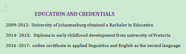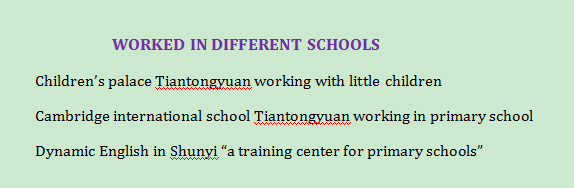 教育和證書 2009-2012年:約翰內(nèi)斯堡大學(xué)獲得教育學(xué)學(xué)士學(xué)位 2014- 2015年:比勒陀利亞大學(xué)幼兒發(fā)展文憑。 2016 -2017年:應(yīng)用語言學(xué)和英語作為第二語言在線證書 工作經(jīng)歷 在不同的學(xué)校工作 少年宮天通苑與小朋友一起工作 劍橋國際學(xué)校天通苑在小學(xué)工作 順義“小學(xué)培訓(xùn)中心”的動態(tài)英語 |
