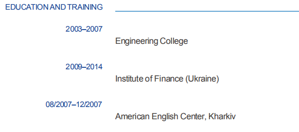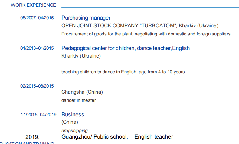 教學(xué)經(jīng)驗: 01 / 2013–01 / 2015兒童教育中心,舞蹈老師,英語哈爾科夫(烏克蘭) 教孩子們用英語跳舞。 年齡從4到10歲。 02 / 2015–08 / 2015長沙(中國)劇院舞者 11 / 2015–04 / 20192019。 廣州商務(wù)/中國公立學(xué)校。 英語教學(xué) 教育背景: 2003–2007工程學(xué)院 2009–2014金融學(xué)院(烏克蘭) 08 / 2007–12 / 2007美國英語中心,哈爾克 |