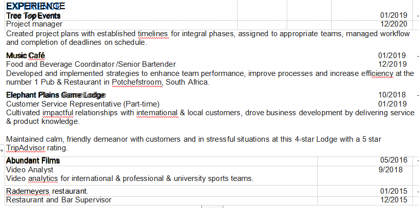 01/2019 -- 項(xiàng)目經(jīng)理12/2020 音樂(lè)咖啡廳 餐飲協(xié)調(diào)員/高級(jí)調(diào)酒師 01/2019- 12/2019 ) 豐富的電影05/2016- 視頻分析師 |