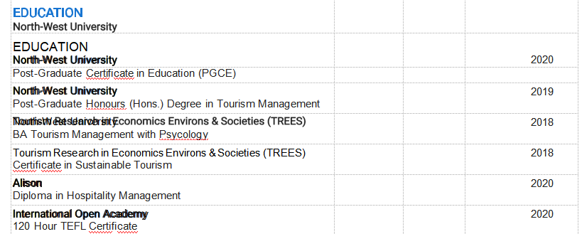 教育 西北大學(xué) 2020年 研究生教育證書(PGCE) 西北大學(xué) 2019年旅游管理研究生文憑(榮譽(yù))學(xué)位 西北大學(xué) 文學(xué)學(xué)士旅游管理學(xué)2018 經(jīng)驗(yàn)