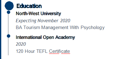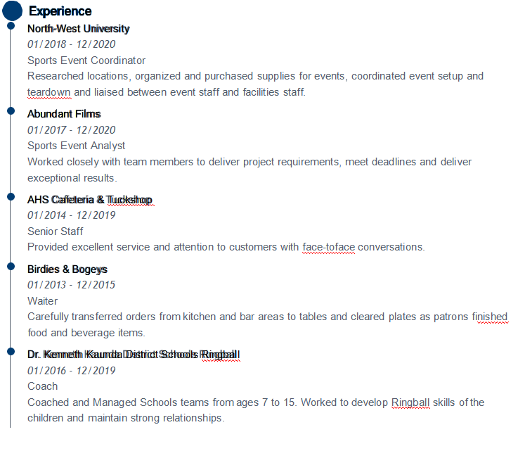 教育 西北大學(xué) 預(yù)計(jì)2020年11月 心理學(xué)旅游管理學(xué)士學(xué)位 國際公開學(xué)院 2020年 120小時(shí)TEFL證書 經(jīng)驗(yàn) 西北大學(xué) 01/2018-12/2020 體育賽事協(xié)調(diào)員 01/2017-12/2020 體育賽事分析師 與團(tuán)隊(duì)成員緊密合作,以交付項(xiàng)目要求,按時(shí)完成任務(wù)并取得出色的成果。 AHS自助餐廳和Tuckshop 01/2014-12/2019 高級(jí)員工 教練 7至15歲的受訓(xùn)和托管學(xué)校團(tuán)隊(duì)。致力于發(fā)展兒童的Ringball技能并保持牢固的關(guān)系。 |