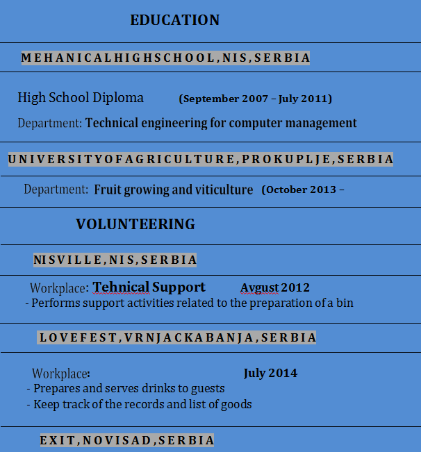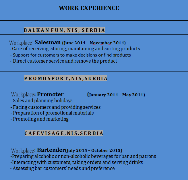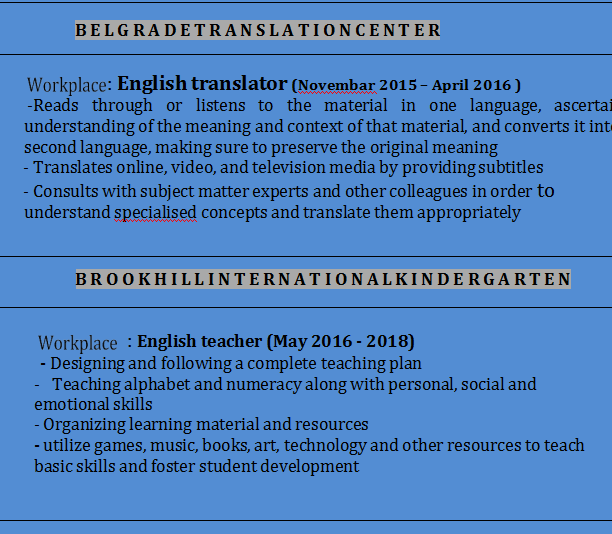 B A L K A N F U N,N I S,S E R B I A :銷售員(2014年6月-2014年11月) -負(fù)責(zé)接收、儲(chǔ)存、維護(hù)和分類產(chǎn)品 -支持客戶做出決策或?qū)ふ耶a(chǎn)品 -指導(dǎo)客戶服務(wù)并移除產(chǎn)品 英語翻譯(2015年11月至2016年4月) -用一種語言通讀或聆聽材料,確定 理解材料的含義和上下文,并將其轉(zhuǎn)換為 第二語言,確保保留原文的意思 -通過提供字幕翻譯在線、視頻和電視媒體 -咨詢主題專家和其他同事,以便 理解專業(yè)概念并適當(dāng)翻譯 酒保(2015年7月-2015年10月) -為酒吧和顧客準(zhǔn)備含酒精或不含酒精的飲料 -與顧客互動(dòng)、接受訂單和提供飲料 -評估酒吧顧客的需求和偏好 英語教師(2016 - 2018年5月)-設(shè)計(jì)并遵循完整的教學(xué)計(jì)劃 -教授字母和算術(shù)以及個(gè)人、社會(huì)和 情感技能 -組織學(xué)習(xí)材料和資源 -利用游戲、音樂、書籍、藝術(shù)、技術(shù)和其他資源進(jìn)行教學(xué) 基本技能和促進(jìn)學(xué)生發(fā)展 |