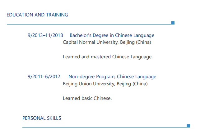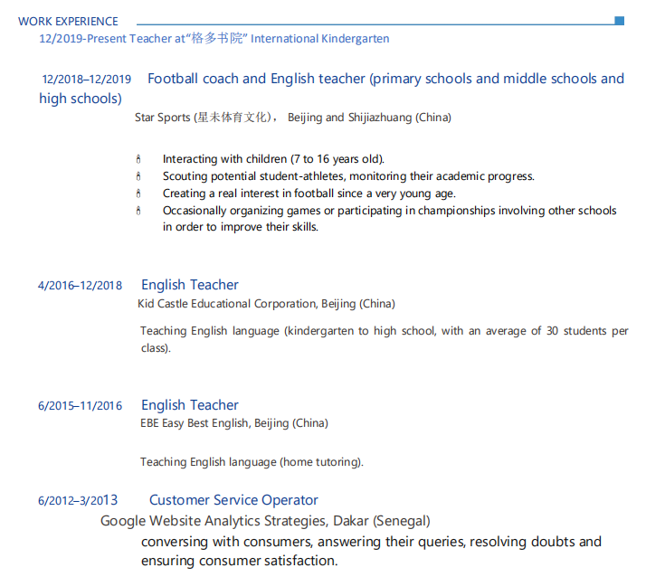 2013年9月-2018年11月中文學士學位 首都師范大學,北京(中國) 學習并掌握了漢語。 9/2011–6/2012非學位課程,中文 北京聯(lián)合大學,北京(中國) 學過基本漢語 中國工作經(jīng)歷 12/2019-現(xiàn)任教師格多書院“國際幼兒園 12/2018–12/2019足球教練和英語教師(小學和中學以及 高中) 明星體育(星未體育文化),北京和石家莊(中國) ?與兒童(7至16歲)互動。 ?發(fā)掘潛在的學生運動員,監(jiān)控他們的學業(yè)進展。 ?從小就對足球產(chǎn)生了真正的興趣。 ?偶爾組織比賽或參加其他學校的錦標賽 以提高他們的技能。 4/2016–12/2018英語教師 兒童城堡教育公司,北京(中國) 英語教學(從幼兒園到高中,平均每班30名學生 類)。 6/2015–11/2016英語教師 EBE簡易最佳英語(中國北京) 英語教學(家教) |