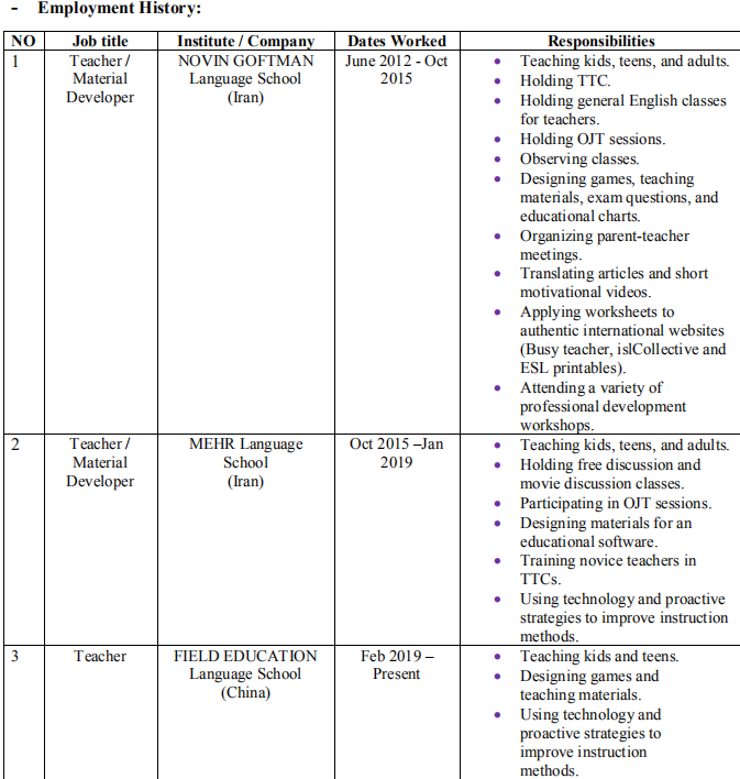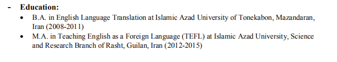 教學(xué)經(jīng)驗(yàn): 2012/6-2015/10:伊朗語言學(xué)校 老師 和材料開發(fā) 201510-2019/1: 伊朗語言學(xué)校 老師和材料開發(fā) 2019-現(xiàn)在:中國菲爾德培訓(xùn)學(xué)校 英語老師 教學(xué)背景: 本科 伊斯蘭阿扎德大學(xué) 英語翻譯專業(yè) 伊朗(2008-2011) 伊斯蘭阿扎德大學(xué)理學(xué)碩士,對(duì)外英語教學(xué)(TEFL),理科 和研究處,伊朗桂蘭(2012-2015) |