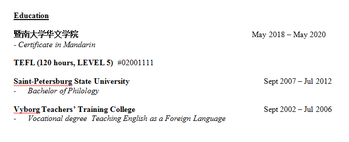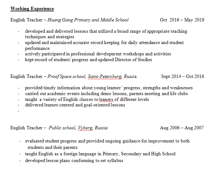 工作經(jīng)驗(yàn) 英語(yǔ)老師–黃岡中小學(xué)2016年10月– 2018年5月 -開(kāi)發(fā)并提供了使用各種適當(dāng)?shù)慕虒W(xué)技巧和策略的課程 -更新并保持準(zhǔn)確的記錄,以保持日常出勤和學(xué)生表現(xiàn) 積極參加專業(yè)發(fā)展研討會(huì)和活動(dòng) 保留學(xué)生的進(jìn)步記錄并更新研究主任 英語(yǔ)老師–空間學(xué)校,俄羅斯圣彼得堡,2014年9月– 2016年10月 及時(shí)提供有關(guān)年輕學(xué)習(xí)者的進(jìn)步,優(yōu)勢(shì)和劣勢(shì)的信息 開(kāi)展學(xué)術(shù)活動(dòng),包括演示課,家長(zhǎng)會(huì)和生活俱樂(lè)部 -向不同級(jí)別的學(xué)習(xí)者講授各種英語(yǔ)課 提供以學(xué)習(xí)者為中心和面向目標(biāo)的課程 -- 英語(yǔ)老師–公立學(xué)校,維堡,俄羅斯2006年8月– 2007年8月 評(píng)估學(xué)生的進(jìn)步,并為學(xué)生及其父母提供持續(xù)改進(jìn)的指導(dǎo) 小學(xué),初中和高中英語(yǔ)作為外語(yǔ)的英語(yǔ)授課 制定了符合課程提綱的課程計(jì)劃 教育 暨南大學(xué)華文學(xué)院2018年5月– 2020年5月 -普通話證書(shū) TEFL(120小時(shí),等級(jí)5)#02001111 圣彼得堡國(guó)立大學(xué)2007年9月– 2012年7月 -語(yǔ)言學(xué)學(xué)士 維堡師范學(xué)院2002年9月– 2006年7月 -職業(yè)學(xué)位英語(yǔ)作為外語(yǔ)教學(xué) |