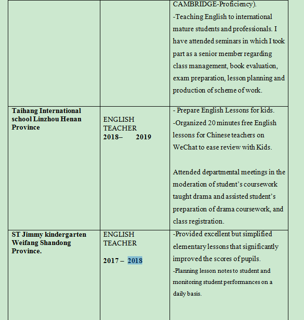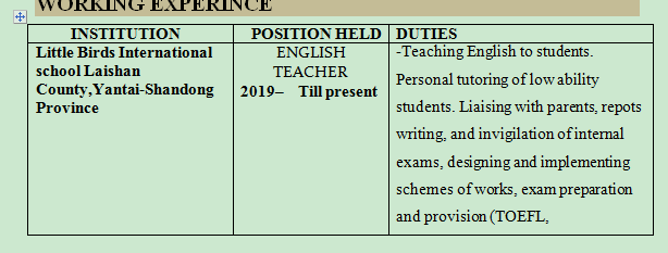 3年以上工作經(jīng)驗,熱愛英語教學(xué)工作。具有高度的組織性和效率,工作方法全面和嚴謹。能夠有效地管理自己的時間,能夠優(yōu)先處理工作任務(wù)。友好、平易近人,希望在課堂教學(xué)和/或行政工作中獲得更具挑戰(zhàn)性的機會,在那里我可以帶來即時的戰(zhàn)略價值,并進一步發(fā)展現(xiàn)有技能。  |