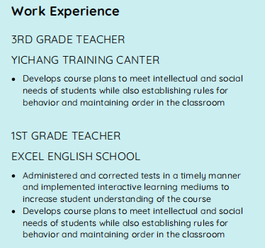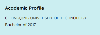 教學經(jīng)驗: 三級教師 宜昌培訓中心: 制定課程計劃以滿足知識和社會需求,學生的需求,同時建立規(guī)則,行為和維持教室秩序 一等教師 教育背景: 重慶工業(yè)大學 2017年學士 |