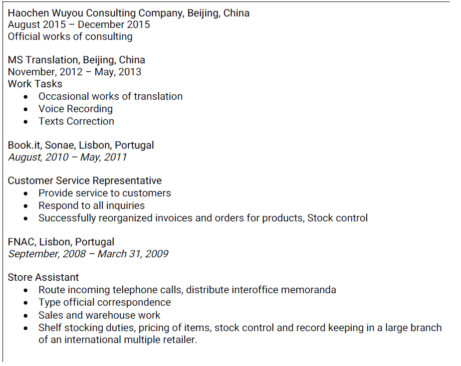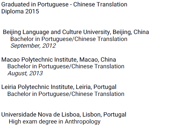 語(yǔ)言流利于葡萄牙語(yǔ)和英語(yǔ),西班牙語(yǔ)會(huì)話能力,中級(jí) |