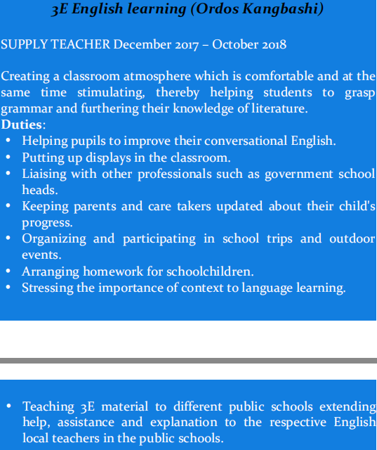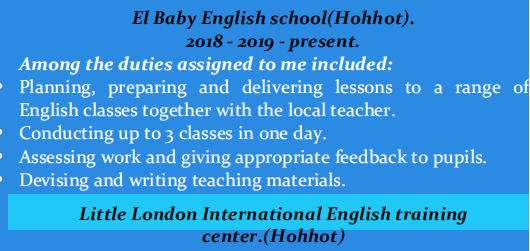 教學(xué)經(jīng)驗: 埃爾寶貝英語學(xué)校(呼和浩特)。 2018年-2019年至今 英語教師 3E英語學(xué)習(xí)(鄂爾多斯·康巴什) 供應(yīng)老師2017年12月– 2018年10月 教育背景: 本科 |