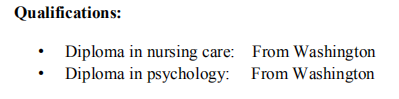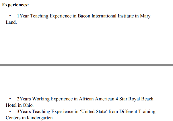 教學(xué)經(jīng)驗(yàn): 瑪麗培根國(guó)際學(xué)院一年教學(xué)經(jīng)驗(yàn) ?2年非裔美國(guó)人四星級(jí)皇家海灘工作經(jīng)驗(yàn)俄亥俄州的酒店。 ?通過(guò)不同的培訓(xùn)在“美國(guó)”工作三年的教學(xué)經(jīng)驗(yàn)幼兒園中心 教育背景: 護(hù)理文憑:華盛頓 ?心理學(xué)文憑:華盛頓 |