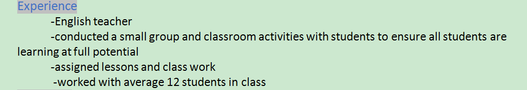 經(jīng)驗 英語老師 -與學生進行小組及課堂活動,確保所有學生都能充分發(fā)揮學習潛能 -指定的課程和課堂作業(yè) -班上平均有12名學生 |