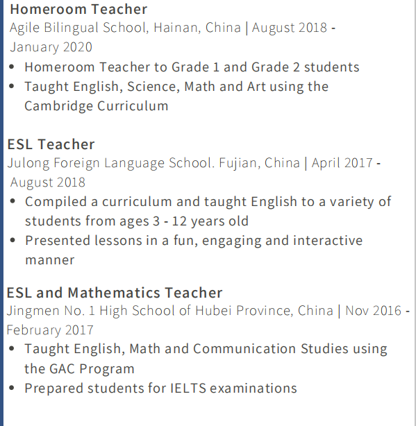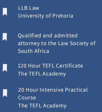 教育 比勒陀利亞法學(xué)士 tefl 經(jīng)驗(yàn) 中國(guó)海南, 雙語(yǔ)教師 中國(guó)福建 英語(yǔ)教師 中國(guó)湖北 , 英語(yǔ)和英語(yǔ)老師 |