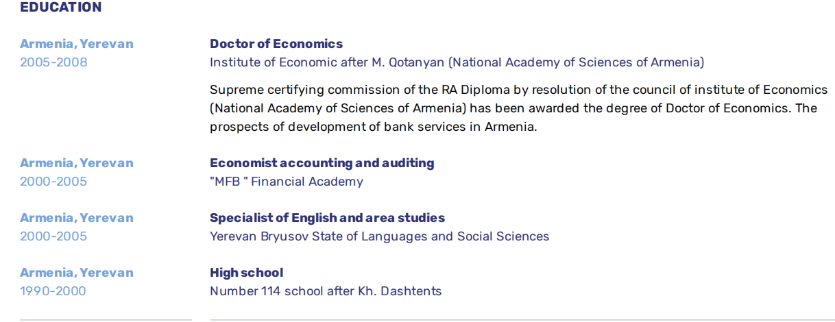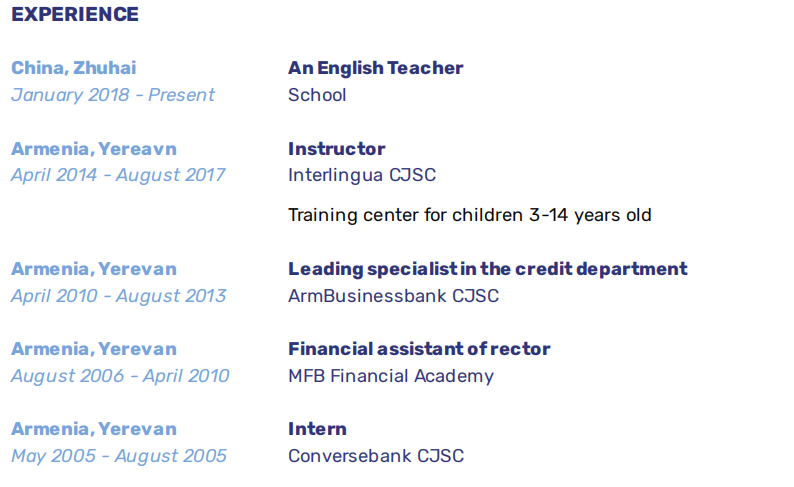 亞美尼亞國家科學院---經(jīng)濟研究所經(jīng)濟學博士 埃里溫 大學 英語碩士 珠海英語老師,2018-2020. 亞美尼亞英語老師 2014-2017 |
