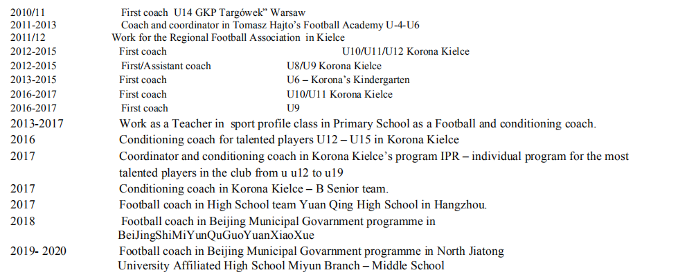 UEFA B許可證 2011年獲得體育學碩士學位 2016年歐洲聯(lián)盟執(zhí)照 2017 NCSC力量與體能教練 2010/11 教練華沙 2011-2013年Tomasz Hajto足球?qū)W院教練和協(xié)調(diào)員 2011/12在凱爾采區(qū)域足球協(xié)會的工作 2012-2015輔助教練 2013-2015年,第一任U6教練-科羅納的幼兒園 2016-2017教練 2016-2017 U9教練 2013-2017年在小學擔任體育概況課的老師,擔任足球和健身教練。 2017年Korona Kielce計劃IPR中的協(xié)調(diào)員和空調(diào)教練-最適合的個人計劃 2017年在杭州遠清中學高中隊任足球教練。 2018年北京市政府足球教練項目 北京米Mi云曲國苑小學 2019- 2020北京加通北區(qū)政府項目足球教練 大學附屬中學密云分校-中學 |
